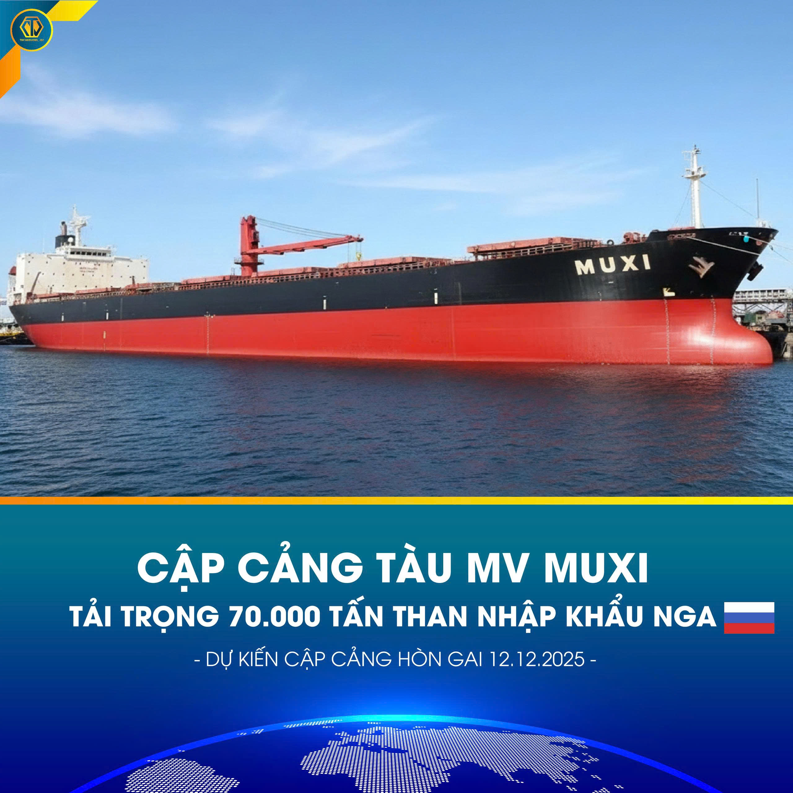 TNV Hải Dương trân trọng thông báo kế hoạch tiếp nhận tàu hàng rời MV MUXI với tải trọng 70.000 tấn than nhập khẩu từ Nga, dự kiến cập cảng vào ngày 12/12 tại Cảng Hòn Gai – Cẩm Phả.